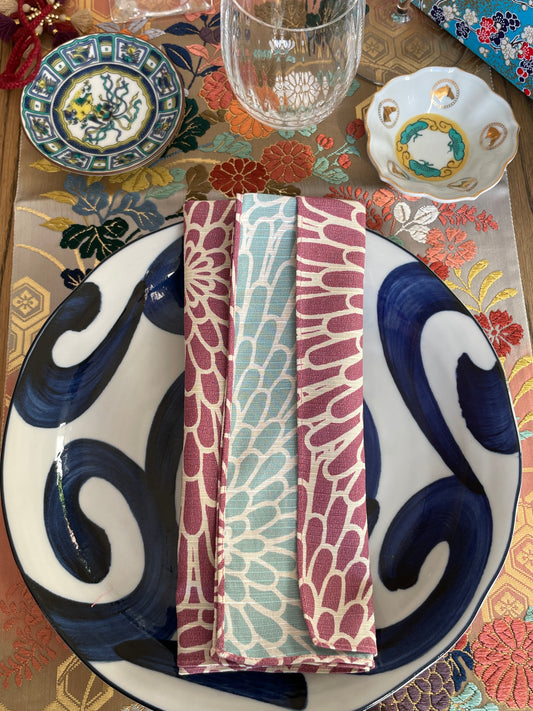 Serviette Furoshiki ISA Monyo Double Face : Kiku (le chrysanthème) Rouge et Blue