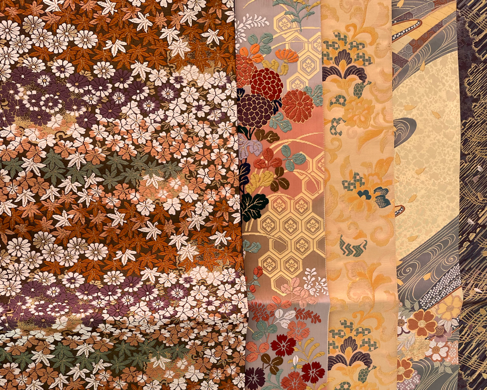 MAISON MIYABI n'utilise que l'Obi Fukuro (袋帯) en soie, un obi richement décoré et orné, utilisé pour les occasions spéciales.