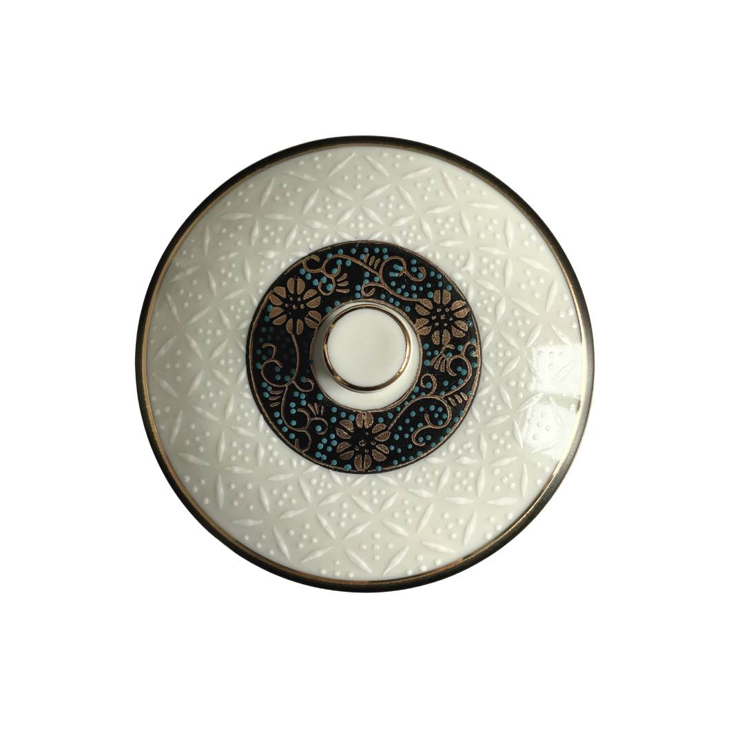 Ces récipients ont été fabriqués à l'origine par des artisans de Kanazawa pour la tasse à thé de Kutani. Ce motif est appelé « shiro-shippo » (cloisonné blanc), le mot « shiro » signifiant blanc.