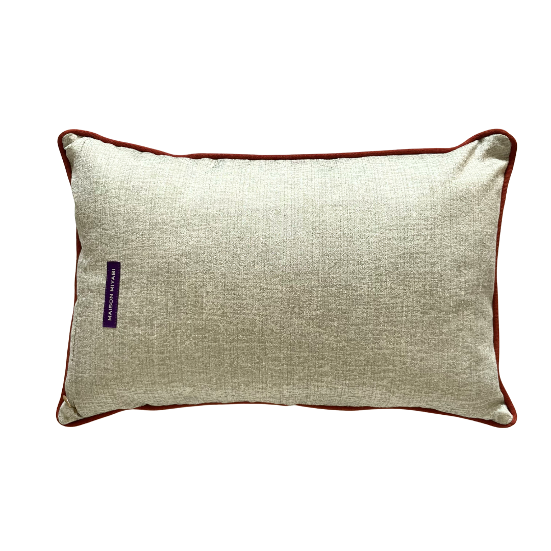 L'Histoire du Motif : L'esprit de la célébration japonaise. Le mot 『UTAGÉ』 évoque un banquet festif où la joie et l'élégance se rencontrent. Ce coussin, réalisé à partir de brocarts de soie aux motifs flamboyants, capture l'éclat d'un instant précieux.