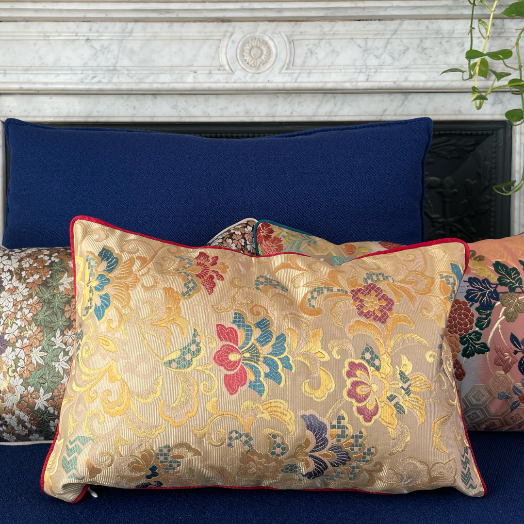 Nos coussins Obi-Kimono ne sont pas de simples objets décoratifs, mais de véritables œuvres d'art. Chaque coussin est fabriqué à la main dans notre atelier parisien, où nous sélectionnons et découpons avec soin des motifs provenant d'authentiques ceintures obi japonaises, qui peuvent mesurer jusqu'à 4 mètres de long.