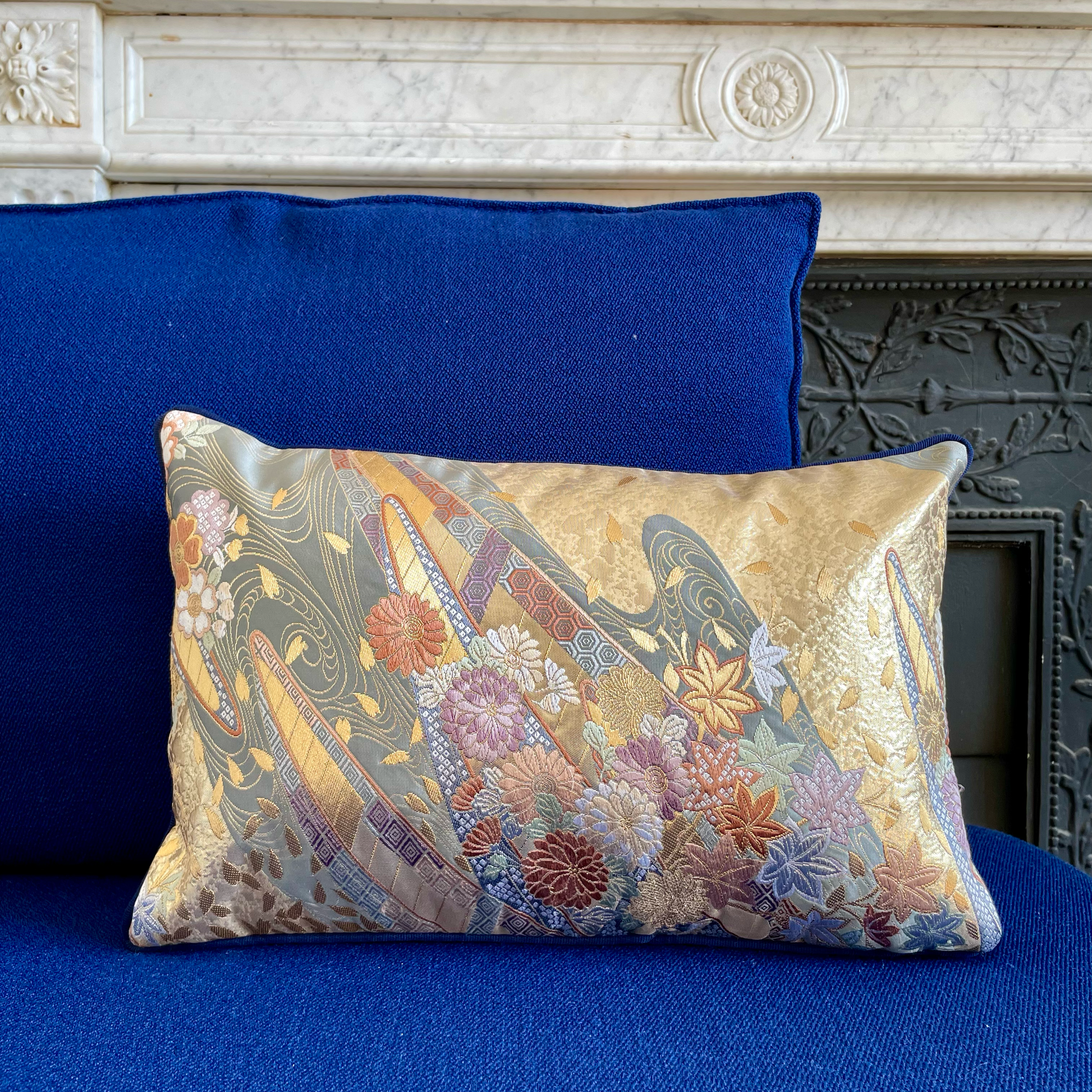L'Obi vient du Nishijin, Kyoto au Japon, et ce coussin est confectionné artisanalement à Paris.