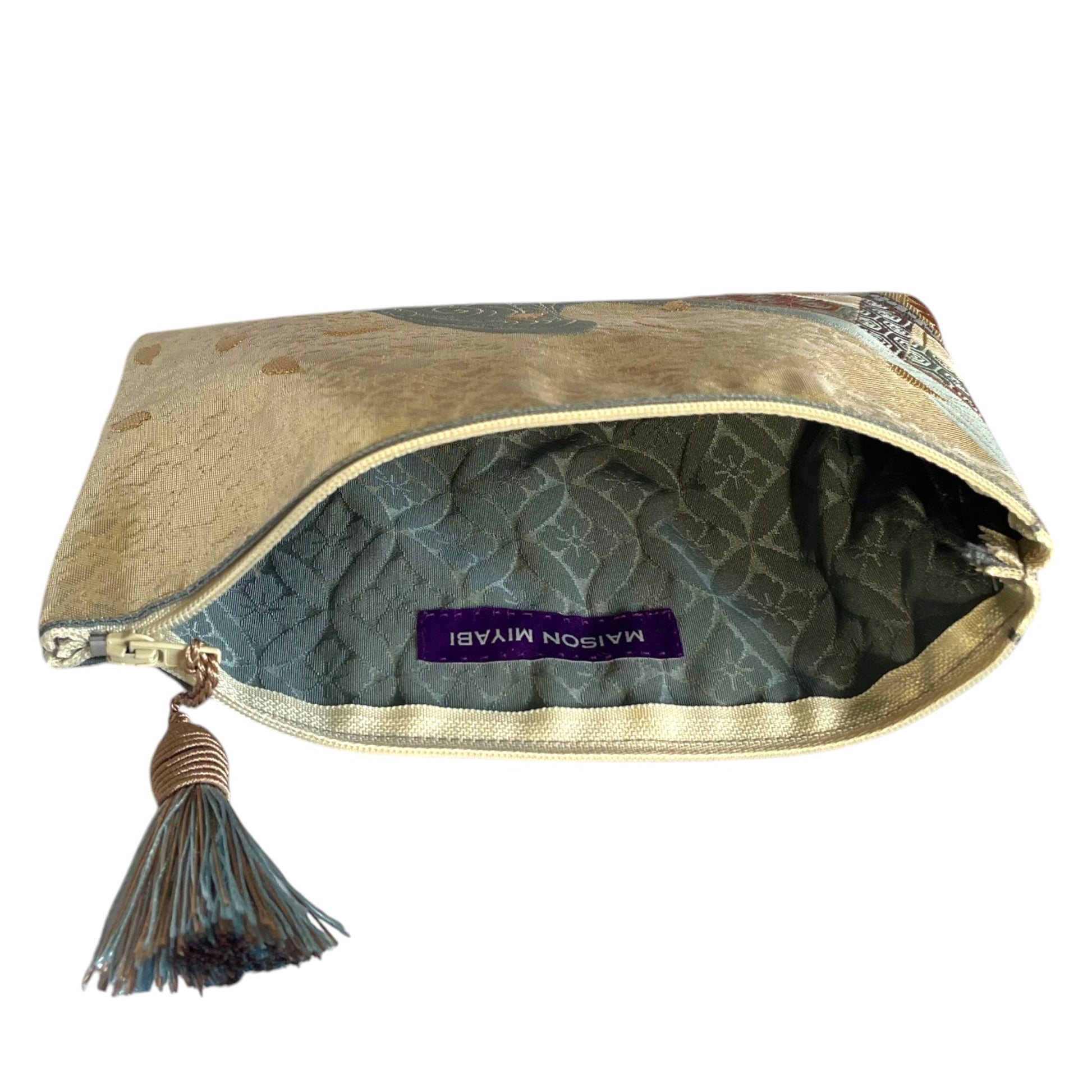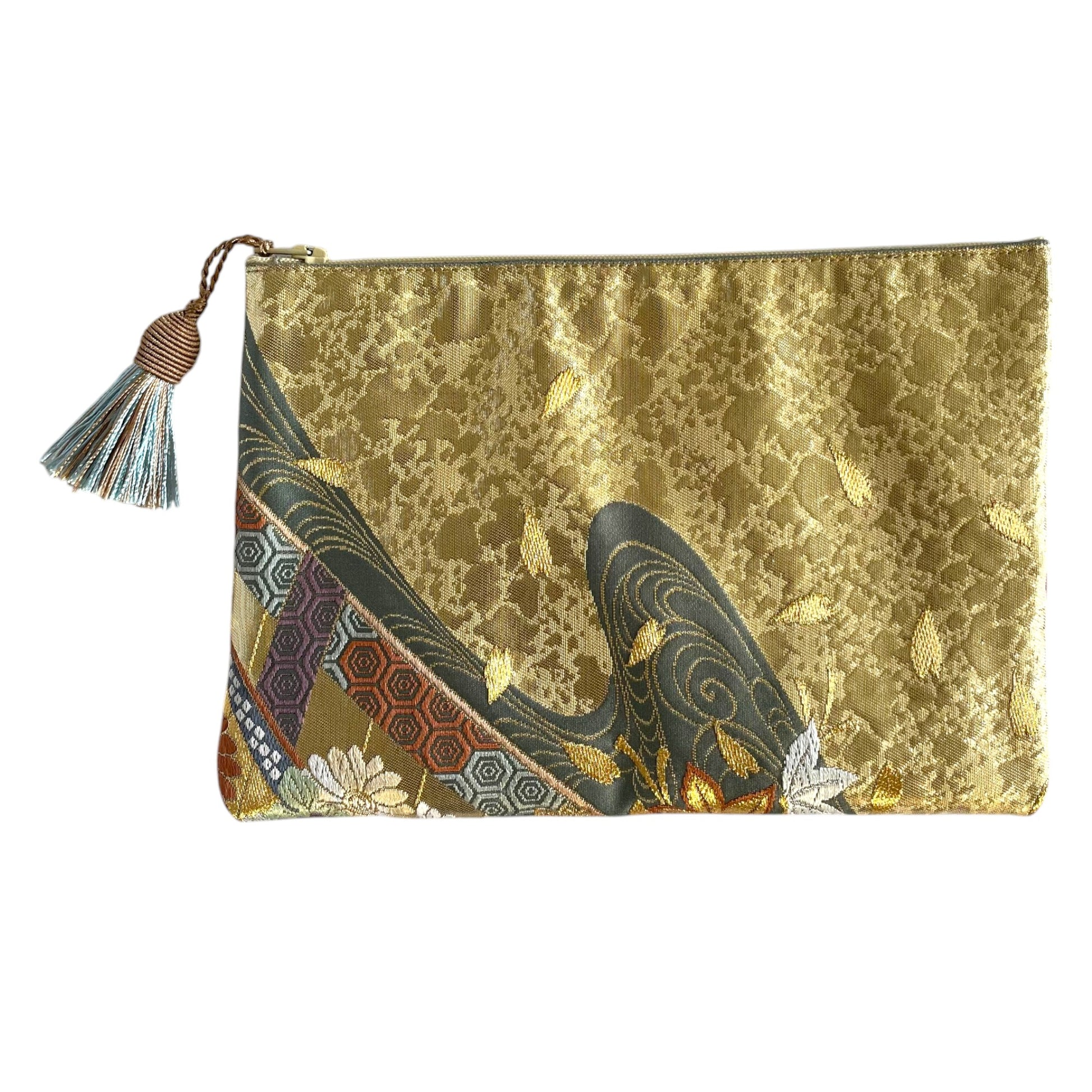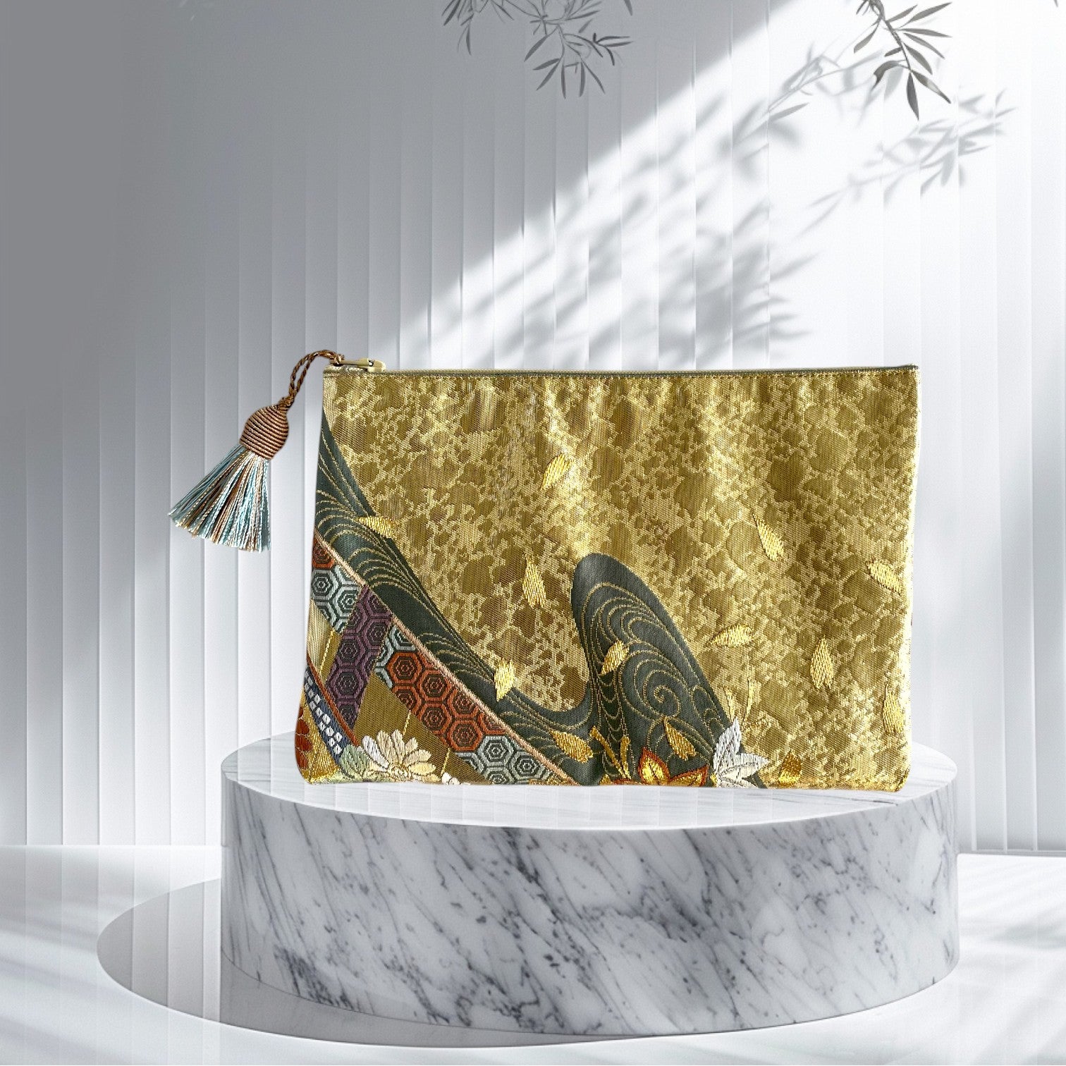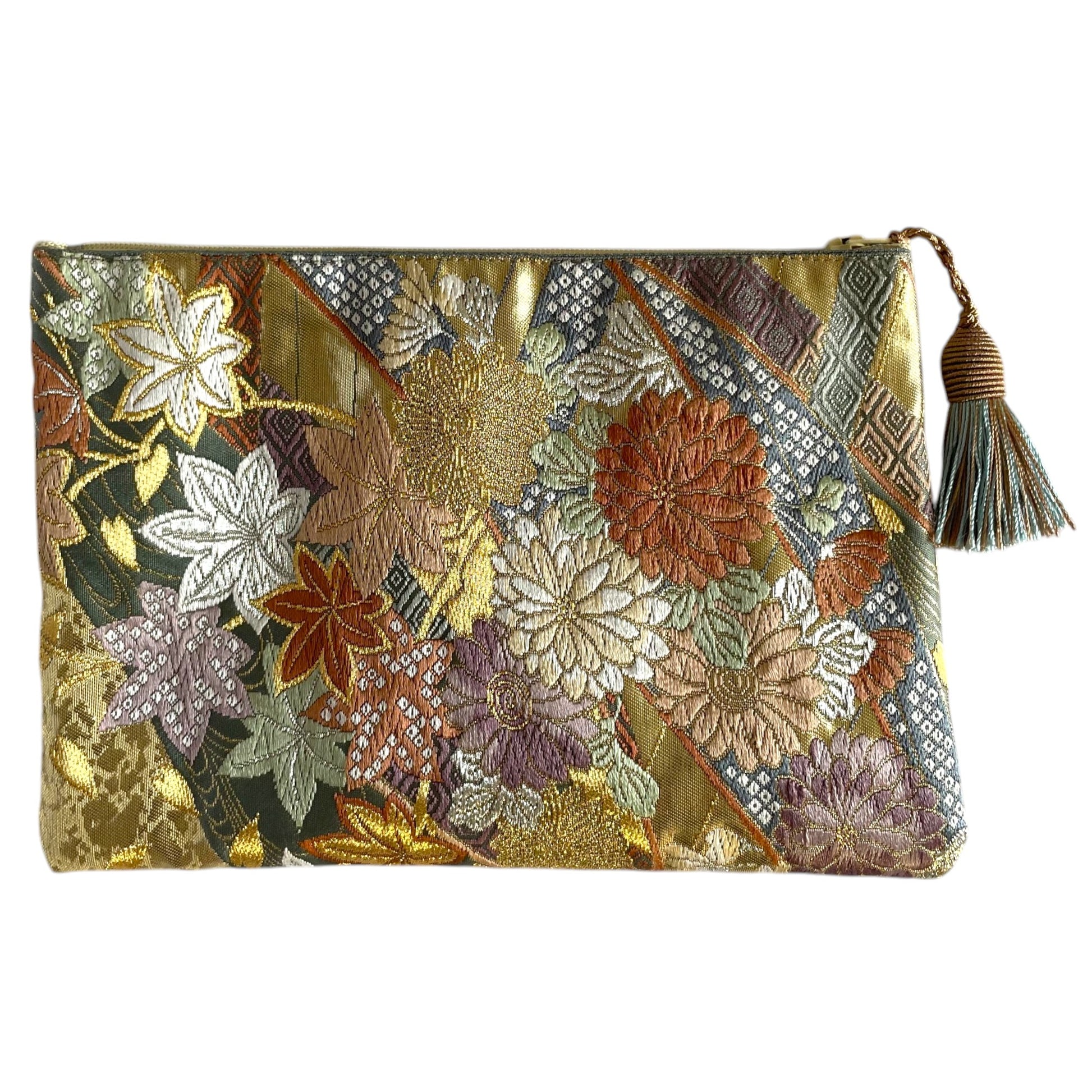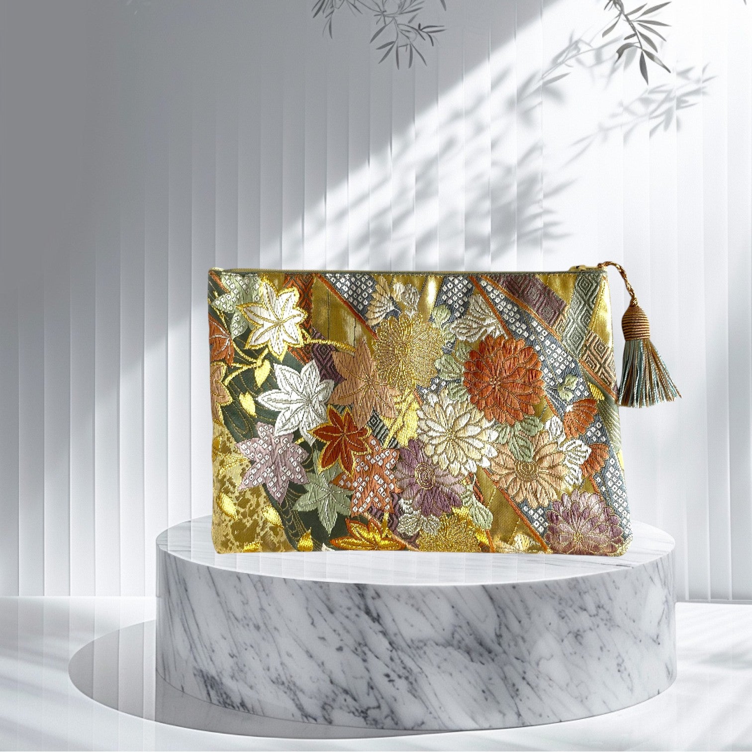 Cette pochette a été fabriquée par un obi entièrement en soie avec le motif de Momiji (Érable japonais). En tant qu'une pochette cosmétique ou sac de soirée, pour mieux organiser votre sac ou pour ajouter un petit tonus à votre intérieur... Accompagnez cette pochette comme votre petit compagnon !