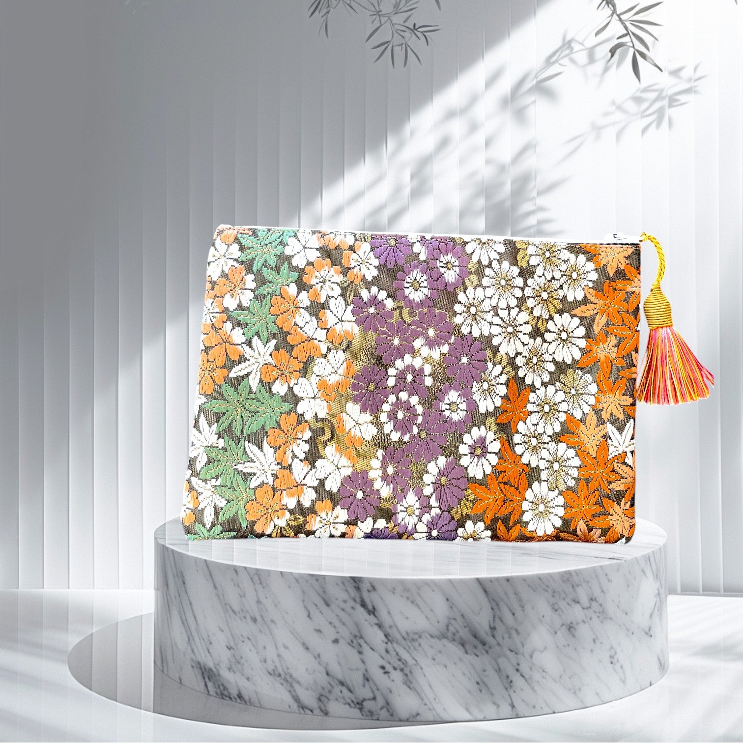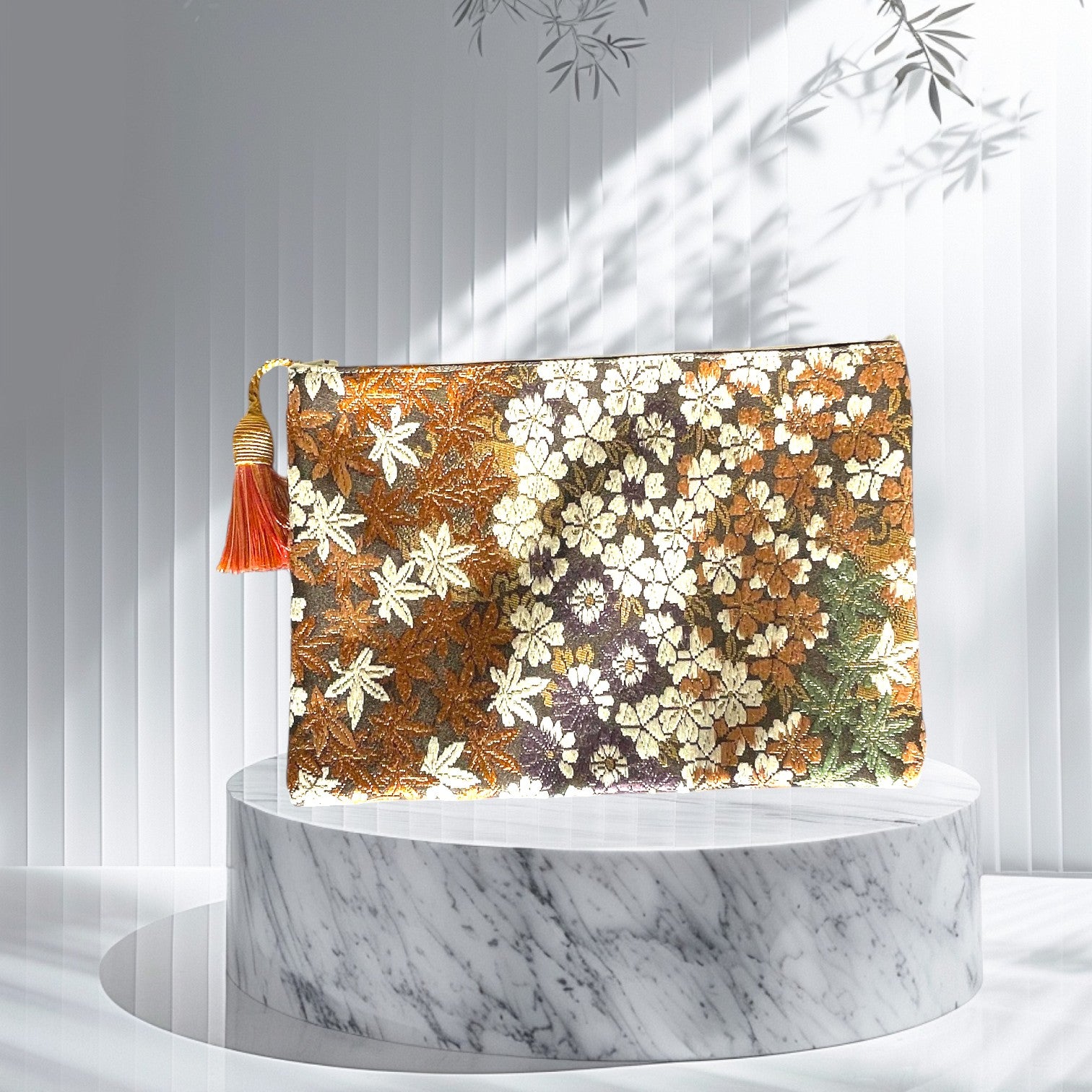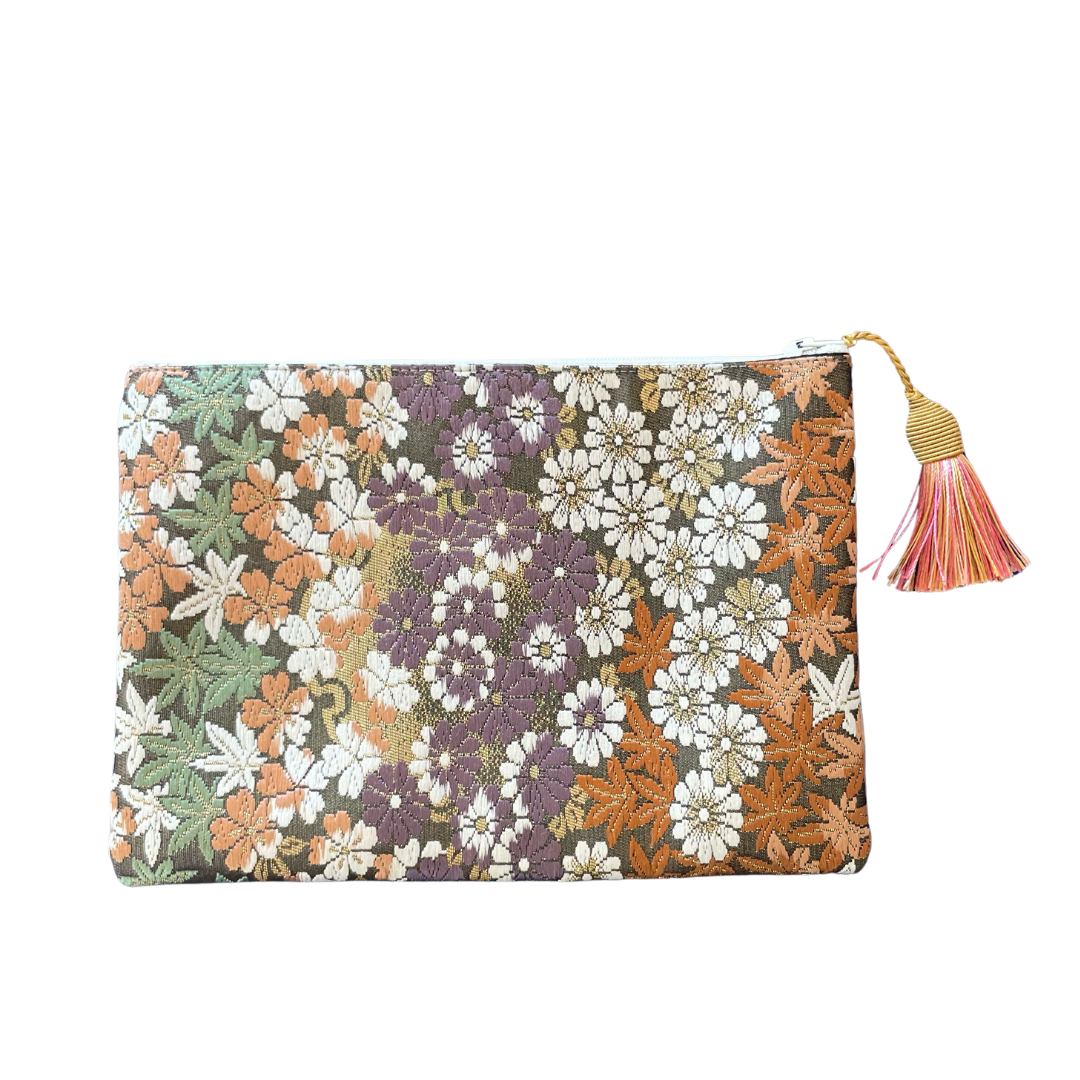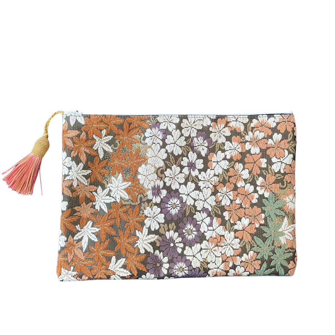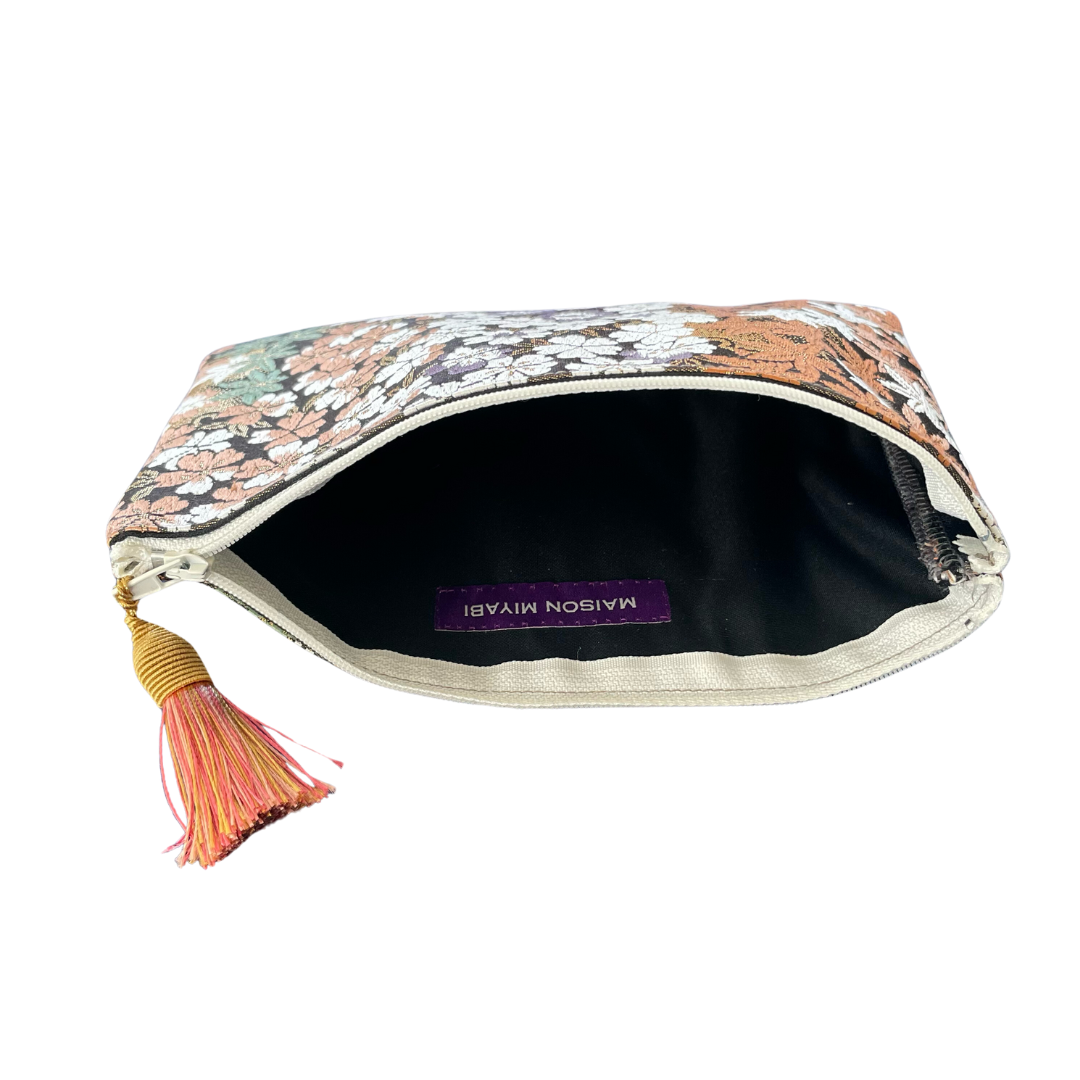 Cette pochette a été fabriquée par un obi entièrement en soie avec le motif de Shiki (Quatre saisons). En tant qu'une pochette cosmétique ou sac de soirée, pour mieux organiser votre sac ou pour ajouter un petit tonus à votre intérieur... Accompagnez cette pochette comme votre petit compagnon !