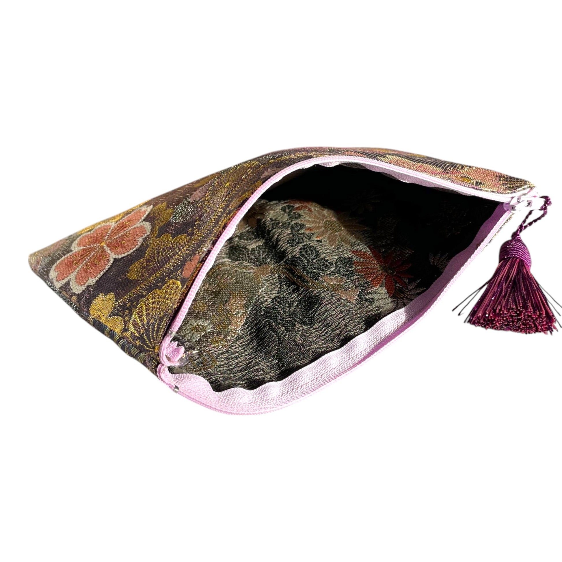 Cette pochette a été fabriquée par un obi entièrement en soie avec le motif de Yozakura (Cerisier la nuit). En tant qu'une pochette cosmétique ou sac de soirée, pour mieux organiser votre sac ou pour ajouter un petit tonus à votre intérieur... Accompagnez cette pochette comme votre petit compagnon !