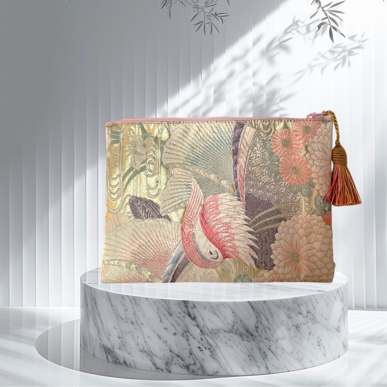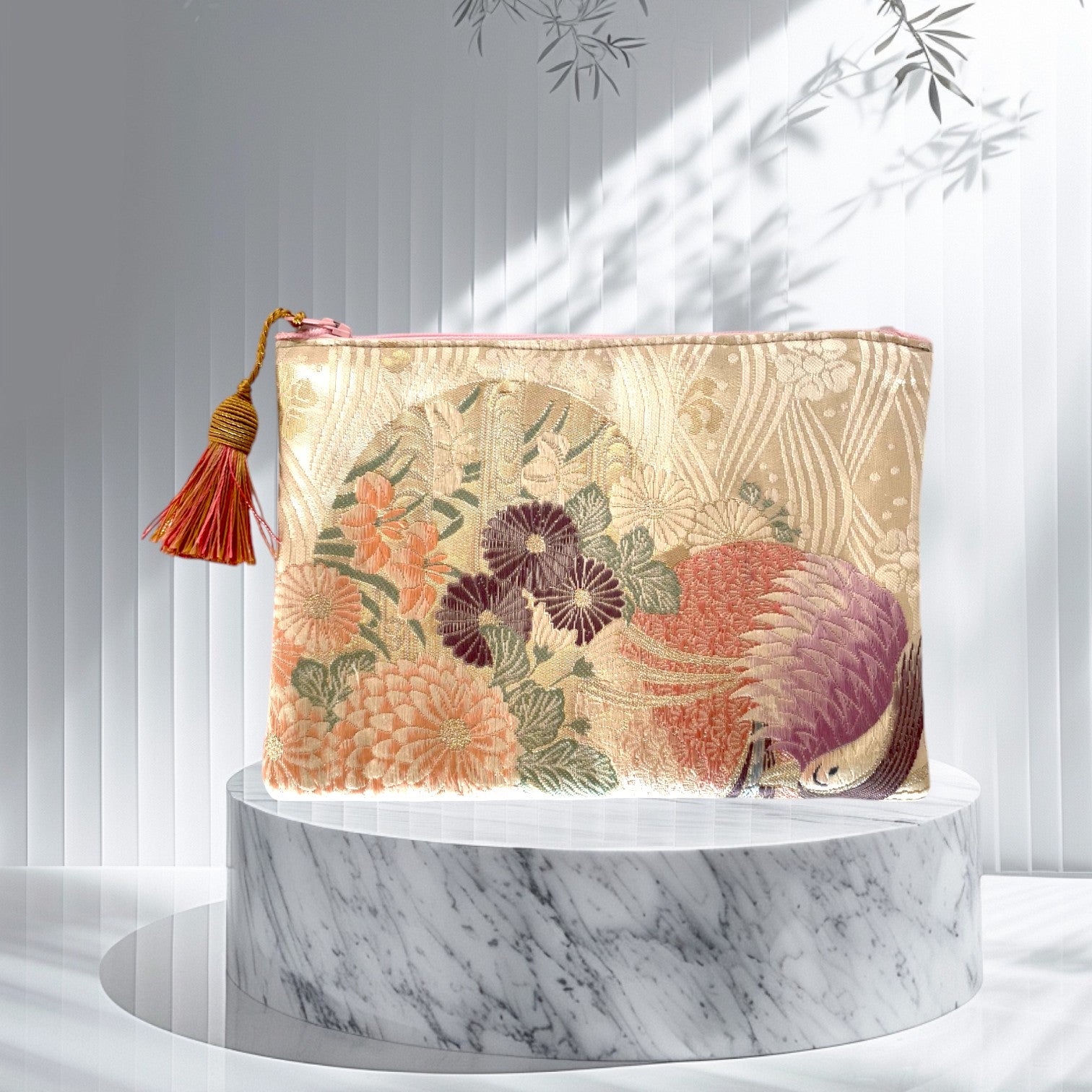 Cette pochette a été fabriquée par un obi entièrement en soie avec le motif d'Oshidori (Canard mandarin). En tant qu'une pochette cosmétique ou sac de soirée, pour mieux organiser votre sac ou pour ajouter un petit tonus à votre intérieur... Accompagnez cette pochette comme votre petit compagnon !